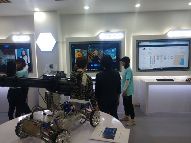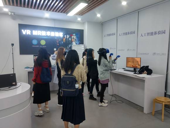 楼1楼西建设人工智能体验园,占地面积204平方,设备价值近120万元。目前,人工智能体验园由视频展示介绍区、机器感知区、互动体验区、机器执行区、虚拟现实区、综合应用区和互动体验区等六部分构成。拥有语音识别演示系统、视频融合演示系统、人脸融合展示系统、图像风格转移系统、可视化神经网络演示系统、六轴视觉机械臂、人机对弈棋盘、车载视觉防卫系统、激光雷达车载套件、虚拟现实解决方案、增强现实解决方案、互动编程试验箱等设备。