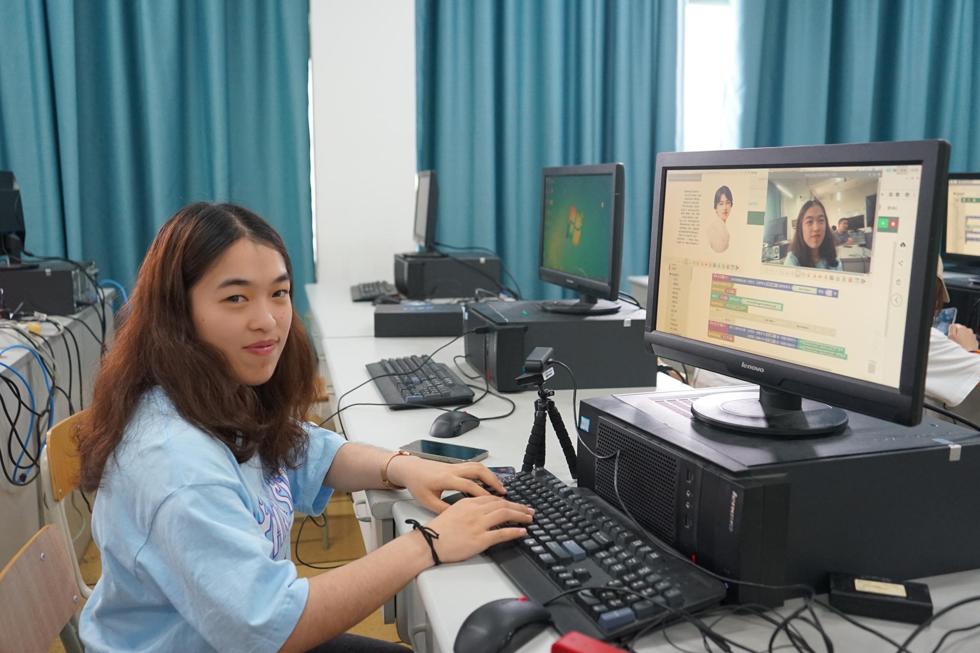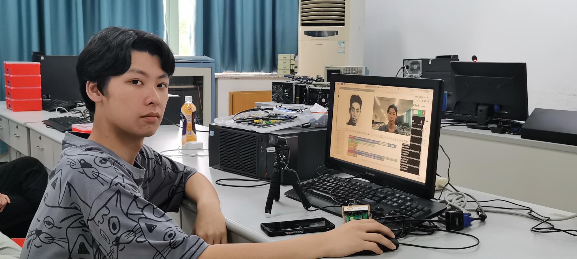 的实验室里,朱凌老师正在给学生们上《智能时代》通识教育课。由于授课对象是文理科学生兼有,同学们编程基础不一,有些甚至是零基础。针对这一情况,朱凌老师大胆尝试教学改革,制定创新教学方案,与古德微机器人共建课程,积极探索产学合作协同育人的人才培养新模式,在人工智能通识教育中将知识与技能融合,采用树莓派图形化编程技术设计了一系列人脸识别、语音识别、文字识别、机器翻译、物联网控制、智能硬件等虚拟仿真实验教学案例,帮助同学们更形象更真切地体验人工智能时代中信息物理空间融合的程序设计在我们工作、学习、生活中的强大应用。