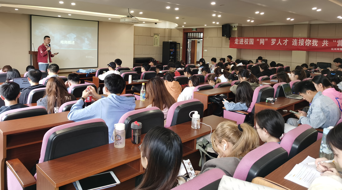 举办了“大数据背景下电商创新思维与创业模式演变”讲座。讲座由电子商务系主任陈明晶主持,杭州网营的数字营销中心经理斯内普(花名)和HR经理安吉拉(花名)联手为学生带来了一场生动活泼又干货满满的经验分享盛会。