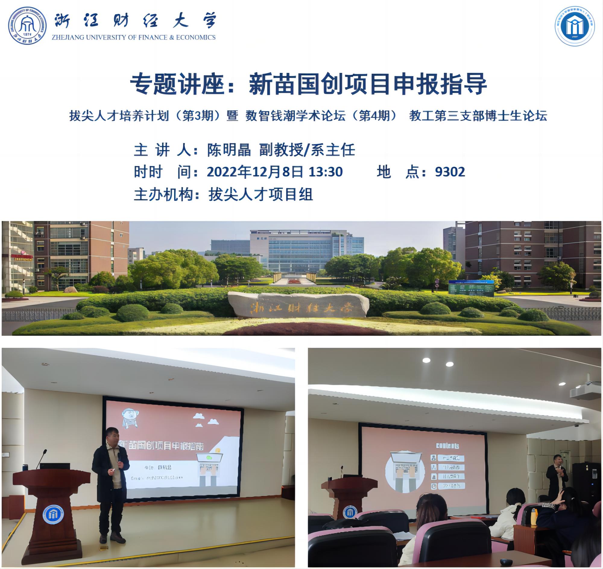 2022年12月8日13点30分,2022年度拔尖人才培养计划(第3期)暨数智钱潮学术论坛(第4期)、教工第三支部博士生论坛在9号楼302教室成功举办。陈明晶副教授/电商系主任以“新苗国创项目申报指导”为主题,让同学们全面了解了参加新苗国创等项目申报的重要性以及申报前准备的注意事项,帮助同学们更好的理解“新苗”和“国创”这两个项目。