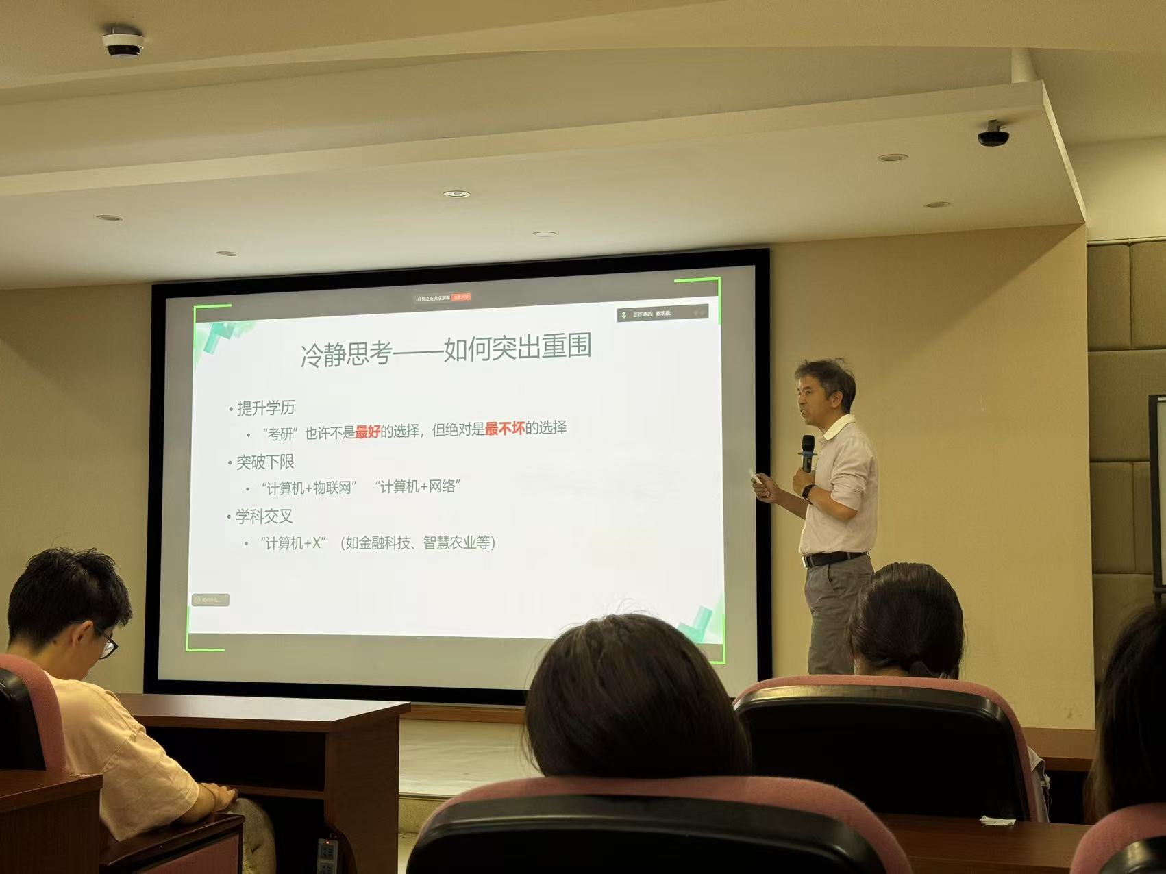 基于计算机专业发展的需求,会上还为学生开展了学业规划指导,从大一的基础课程学习、专业兴趣培养,到大二的专业课程深入、实践技能提升,再到大三的专业方向选择、科研项目参与,以及大四的企业实习、项目实战,每个阶段都给出了具体的学习目标与建议。同时,他还鼓励同学们合理安排时间,积极参加各类学科竞赛与社团活动,全面提升自己的综合素质。