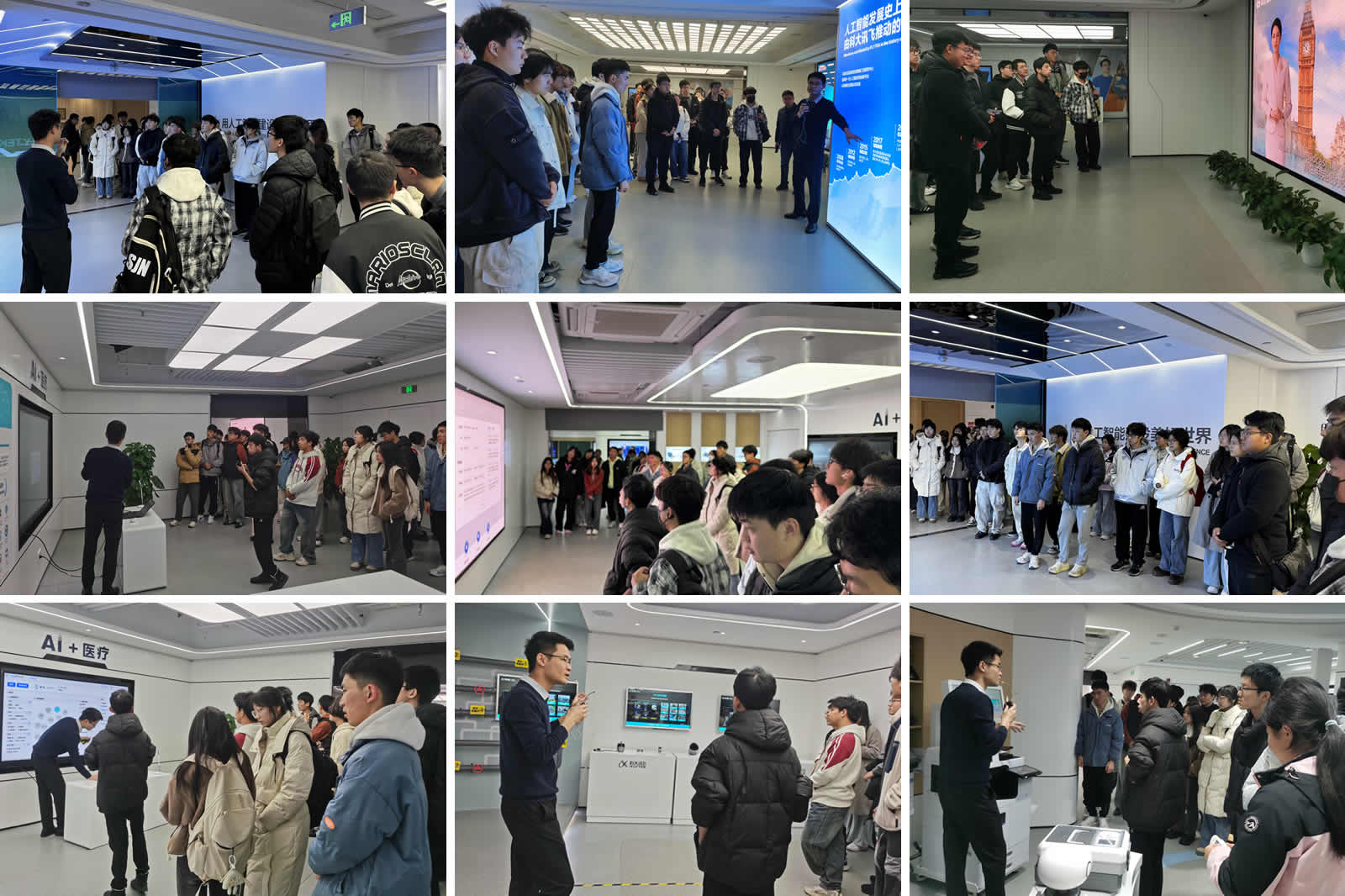 同学们首先参观了科大讯飞AI产品与行业应用展厅。在讲解员的引导下,大家亲身体验了讯飞星火认知大模型在智慧教育、智慧医疗、智慧政务等领域的创新应用。通过现场演示,同学们对AI语音识别、自然语言处理等核心技术如何赋能产业发展形成了直观认识。展厅中,可实现实时多语言翻译的智能办公本、助力教师实现精准教学的智慧课堂系统等产品,引起了同学们的浓厚兴趣。