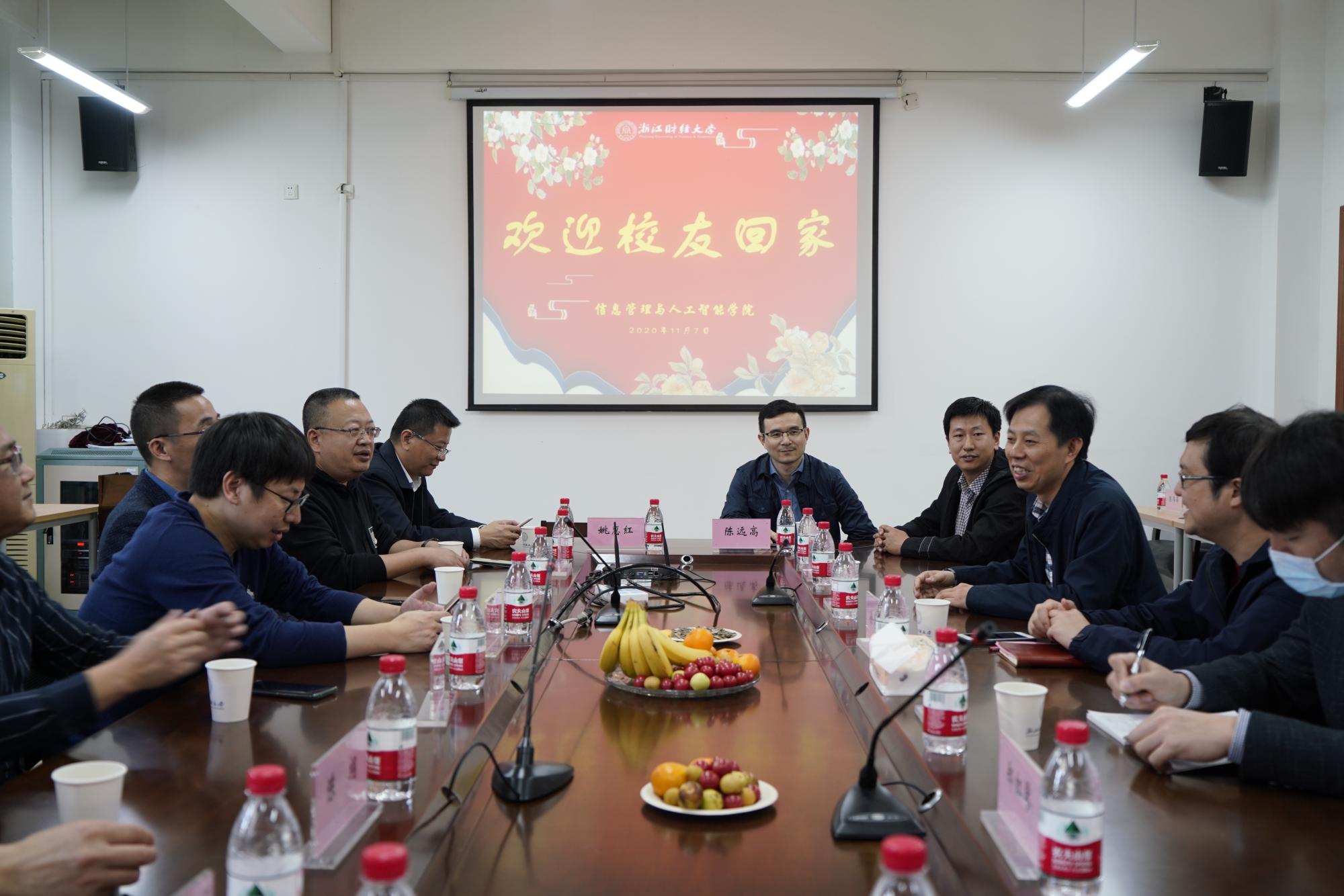 于9404会议室举行了校友欢迎仪式。陈远高副院长致辞欢迎各位校友的到来。随后,张帅院长介绍了棋牌 APP