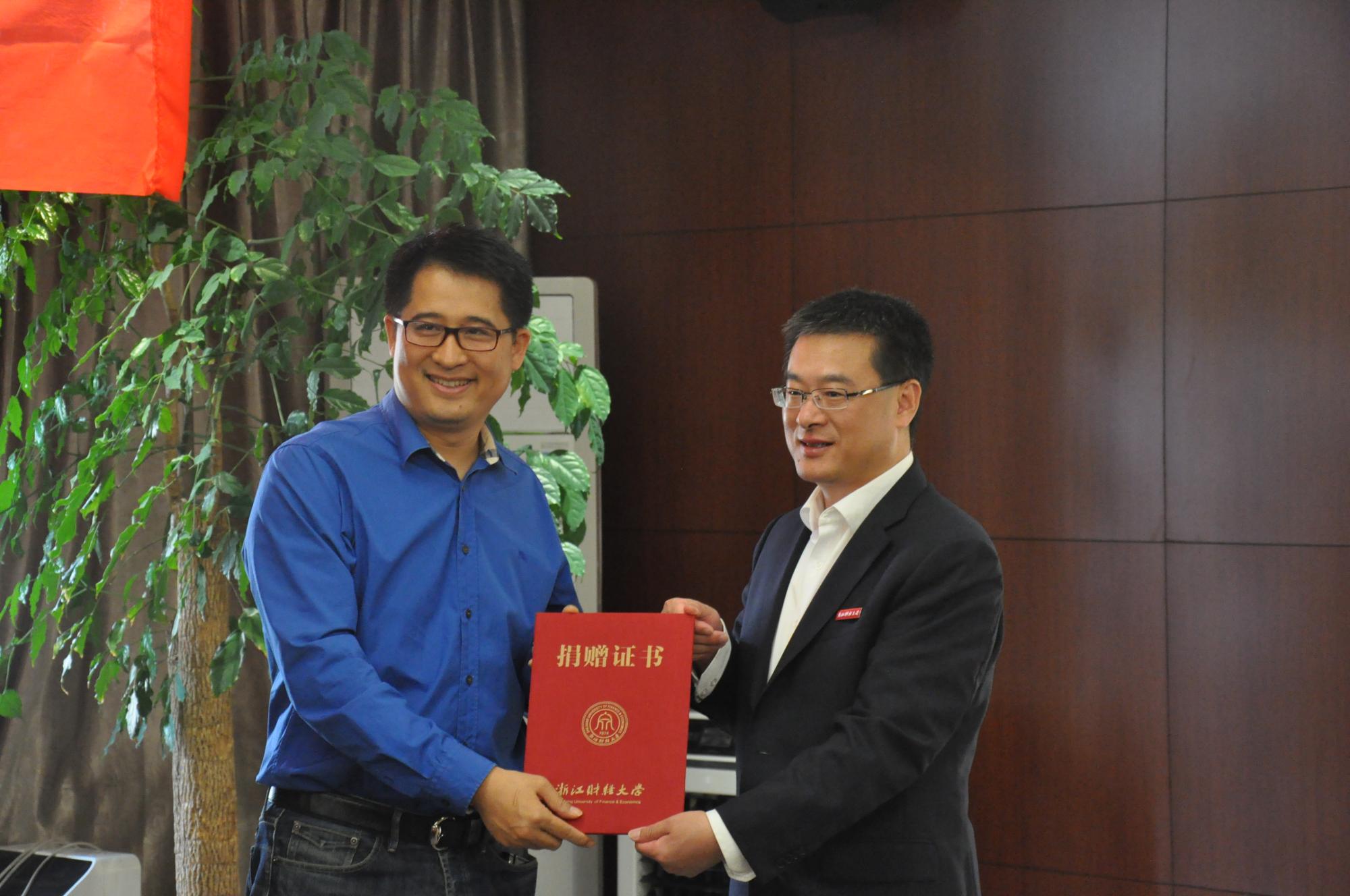 在签约仪式上,徐晓东副校长为楼栋校友颁发了捐赠证书和纪念杯。