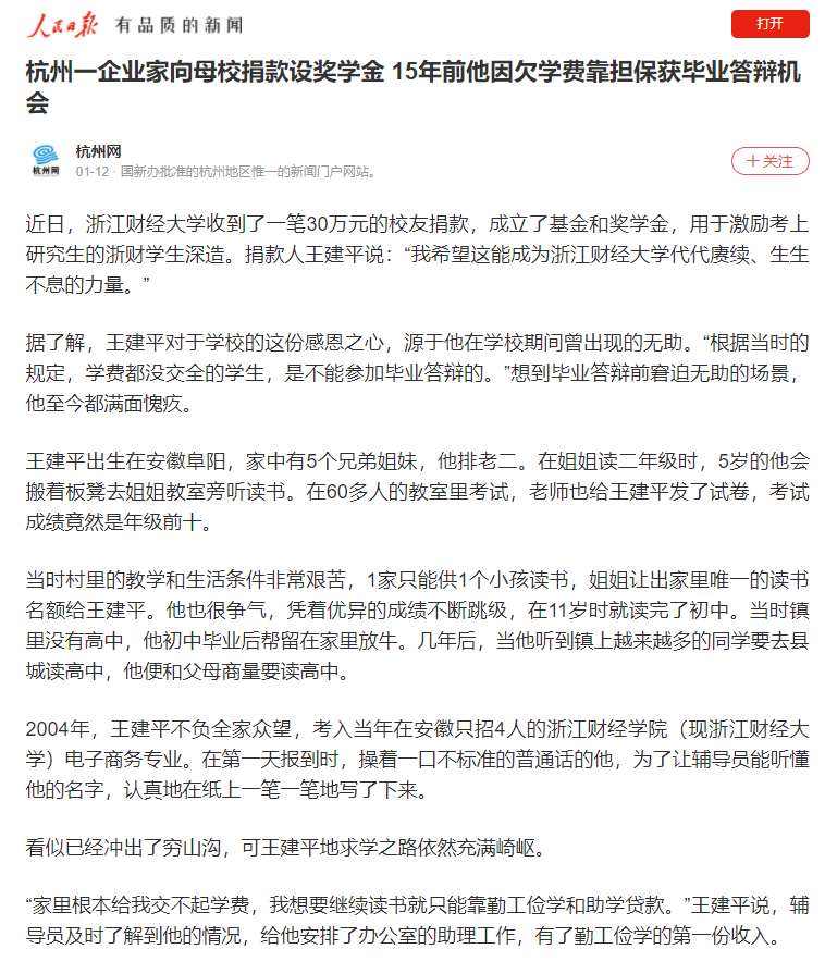 收到了一笔30万元的校友捐款,成立了基金和奖学金,用于激励考上研究生的浙财学生深造。捐款人王建平说:“我希望这能成为棋牌 APP