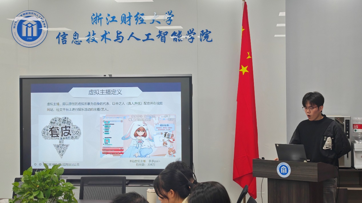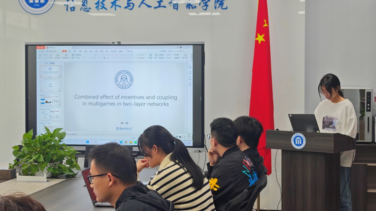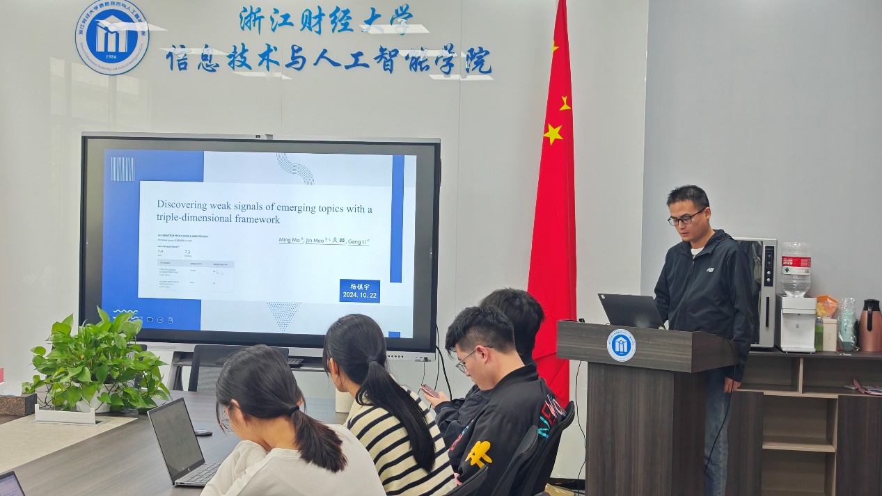 李罗南、刘芸、李一鸣、谭瑞斌以及杨镇宇同学,分别就“lmpact of viewer-streamer-content congruence on users’ behavioraintention in virtual streaming: the moderating effect of role- playing”、“中国种植业碳排放时空演变特征及影响因素分析”、“双层网络中多游戏激励与耦合的联合效应”等议题进行了深入的探讨与分享。他们的研究不仅在学术上有着重要意义,也为现实世界的技术应用提供了新的思路与启示。还有对用三维框架发现新兴话题的微弱信号的精彩介绍,以及关于人工蜂群算法应用于在制造系统的研究成果,让参会者们对于前沿技术的发展有了更深入的了解和认识。