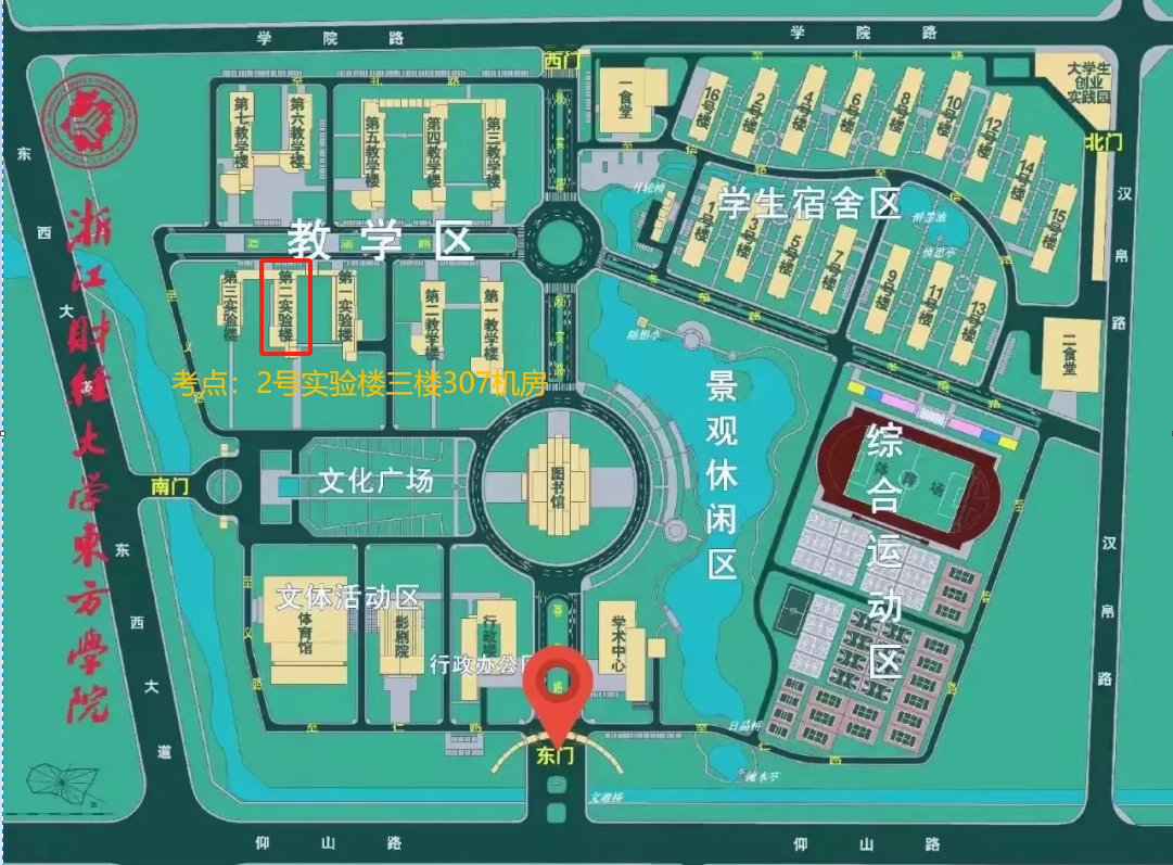 东门(仰山路)进校,到达考试地点(2号实验楼三楼307机房)。