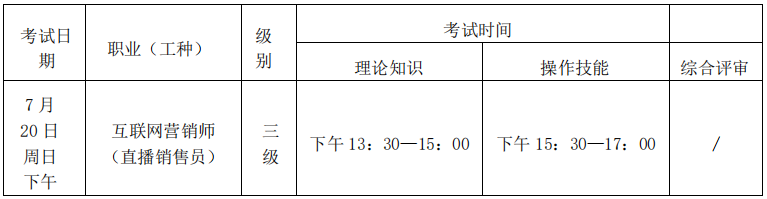 考试时间为2025年7月20日(周日)下午,请考生根据申报的职业(工种)和等级参加考试,具体安排如下: